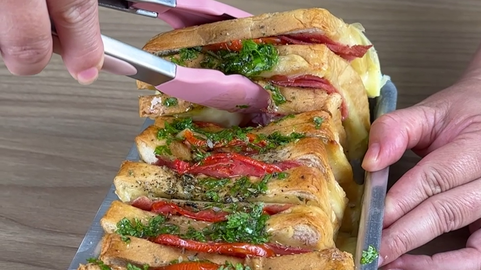 Esta receita de pão de forma recheado promete ser uma delícia, combinando o sabor suave do queijo e do presunto com a frescura do tomate, tudo embalado em um pão úmido e saboroso. É finalizado com uma cobertura especial de azeite e cheiro-verde, oferecendo um toque aromático e apetitoso. Perfeito para um lanche ou refeição leve, este pão de forma recheado é fácil de preparar e agrada a todos os gostos.