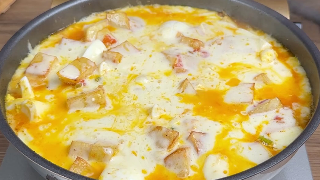 4. Adicione as batatas fritas e os ovos cozidos aos vegetais refogados.