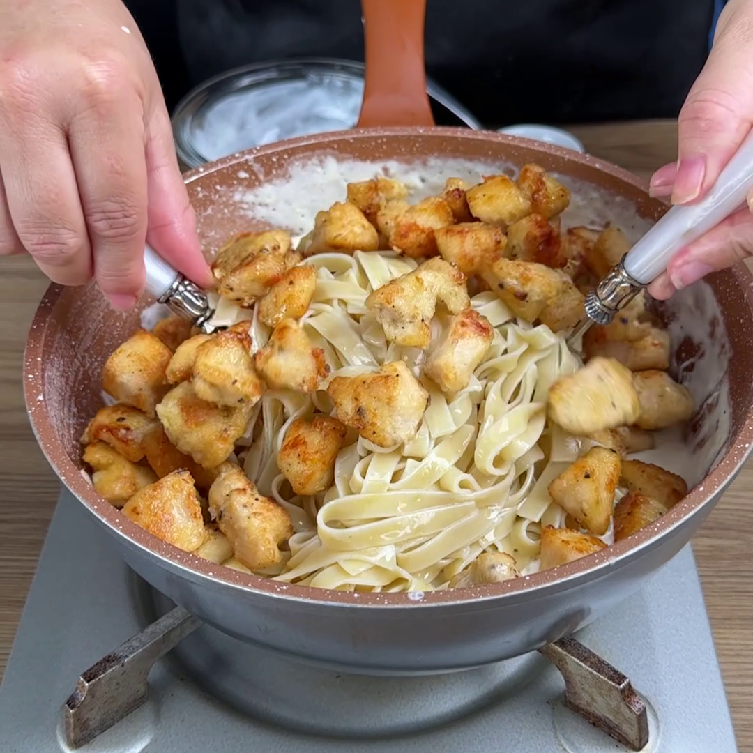 7. Adicione o macarrão cozido e o frango frito.