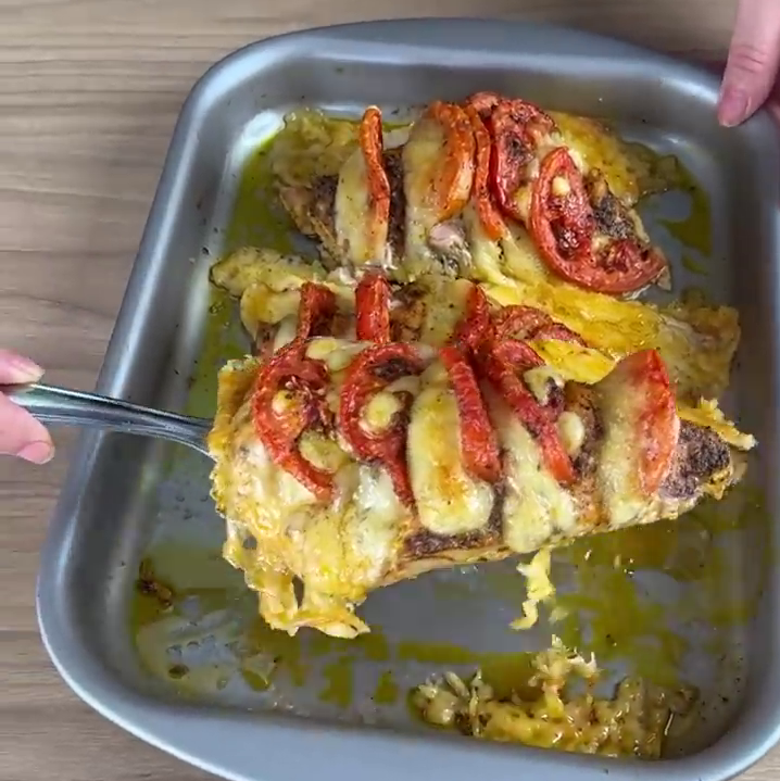 Em seguida vou colocar 1 fatia de queijo e 1 fatia de tomate e colocar em cada corte no frango.