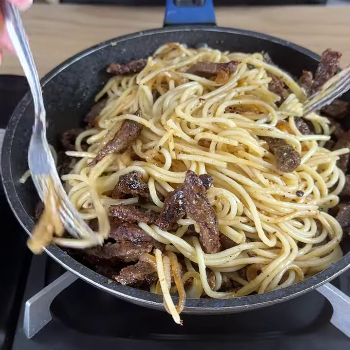 Depois transfiro a carne pronta para a frigideira com a cebola e vou misturar, em seguida adiciono macarrão cozido e misturo novamente.