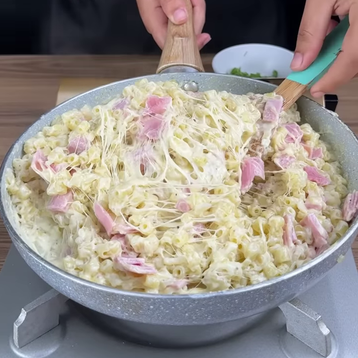Macarrão na frigideira com queijo e presunto