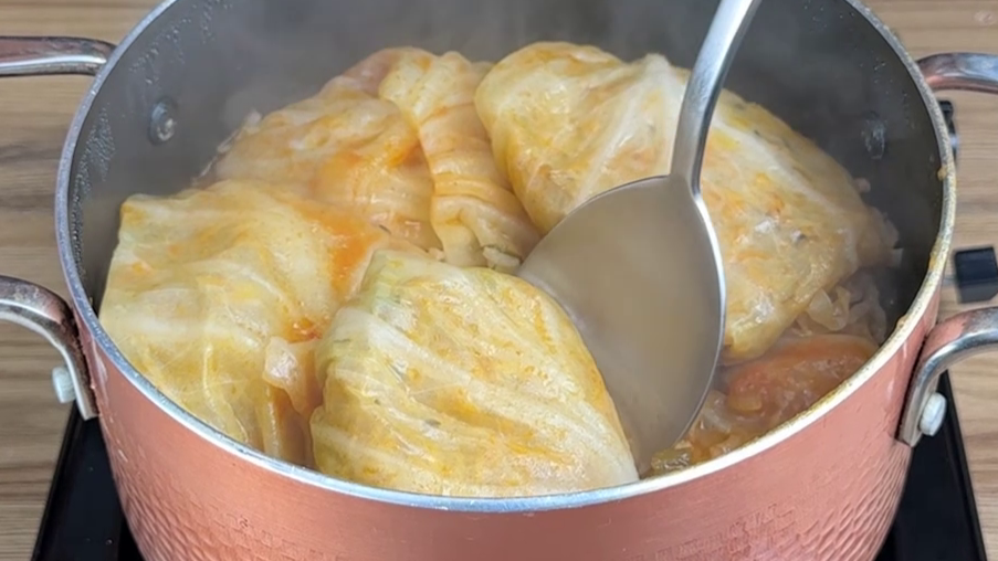 7. Arrume as folhas recheadas numa panela, despeje o molho preparado e cozinhe por 40 minutos.
